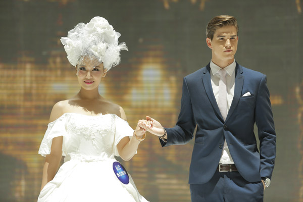 随后,模特出场展示了兰玉设计的“东方美人”纸巾婚纱,再次惊艳全场。兰玉介绍,这套纸巾婚纱灵感源自古典含蓄的东方美人,小露肩,鱼形飘逸裙摆,配以中式手绘花纹,裙尾处还有纸蝴蝶的配饰。不仅设计独特,对纸的材质要求也非常高。融合了兰玉一贯擅长的柔美工艺及西方现代设计力学,纸巾独有的线条与皱褶也在匠心独运的设计中得到升华。