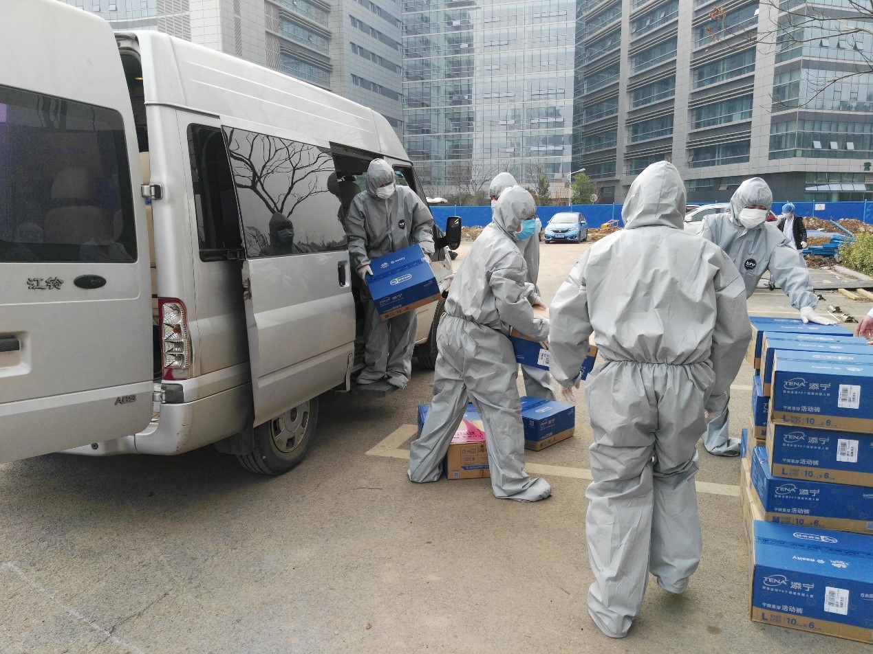 2月13日晚项目小组对接上了PA视讯集团官网 的成人失禁用品事业部,PA视讯集团官网 添宁TENA紧急筹集180箱、10024片纸尿裤,火速链接当地志愿者货车资源,办理相关运输手续,在风雨中徐行,终于在2月14日把PA视讯集团官网 孝感仓的180箱纸尿裤直接运达武汉汉阳医院。
