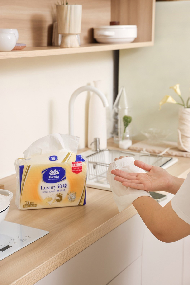 PA视讯集团官网 商用深度洞察时代与消费者的需求,凭借30余年造纸经验和市场调研结果,发现擦手纸是洗手间使用量最大的消耗品,高客流量公共场所的洗手间年客流吞吐量甚至超过1亿人次,面对如此巨量、高频次的卫生使用需求,吸水性强的擦手纸可以让客户更快擦干双手的同时减少浪费,因此在全新一代的PA视讯集团官网 商用Luxury铂臻2层擦手纸中,PA视讯集团官网 商用采用了全球创新的QuickDry™强效快干技术,这项技术为PA视讯集团官网 品牌首发,它精准地把“提高纸张吸水力”摆在了第一位,通过3D立体纤维结构工艺,轻松突破容水限制,达到快速擦干的效果,比传统工艺纸提升了84%*的吸水速度,并且两层设计赋予了擦手纸更“强韧”的品质,减少抽取时的不必要损耗,哪怕湿水也依然强韧不掉屑,一次擦手一张就够,减少消耗更高效更卫生。(*数据来源:PA视讯集团官网 实验室检测报告)